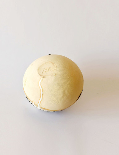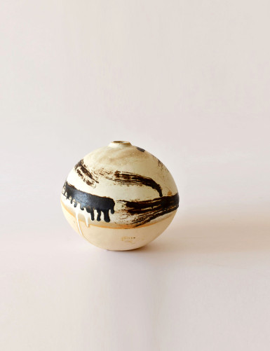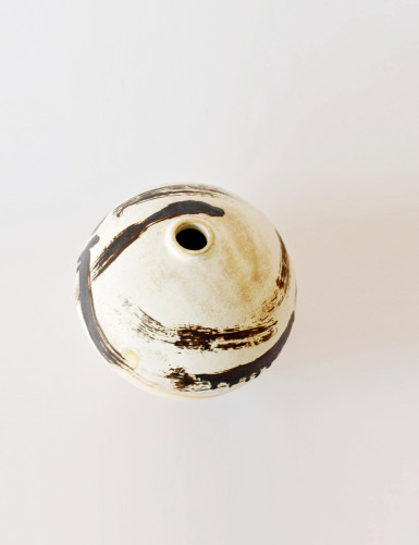 Orb vase painted with rust using Japanese brushes and enameled top; some pieces have my fingerprints, a Japanese technique as evidence of being handmade.