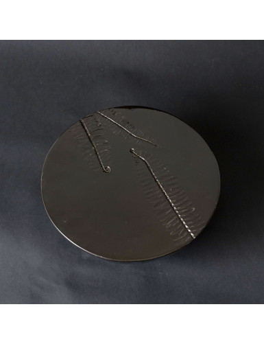 VEGETATION I. Decorative black ceramic with plant prints, modern circular sculpture, Biophilic art