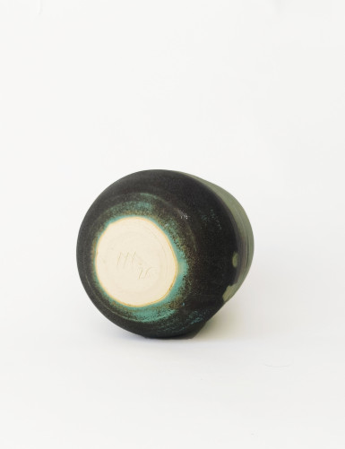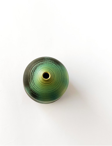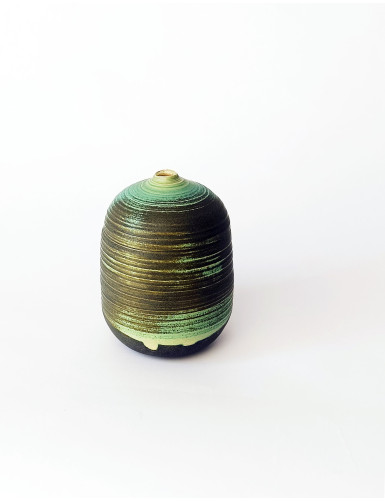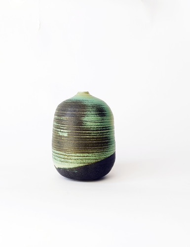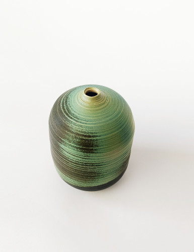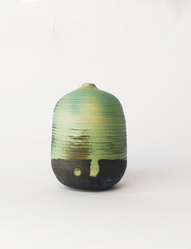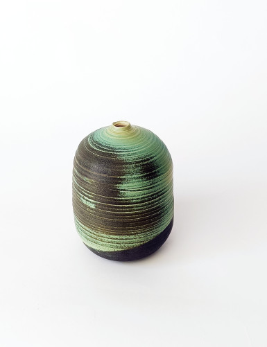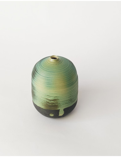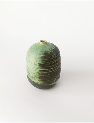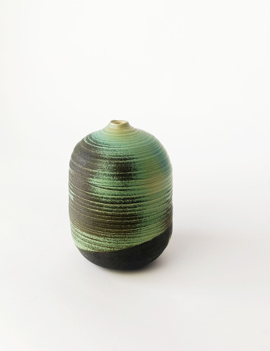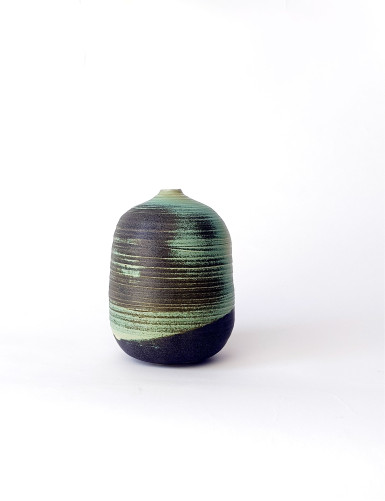 This unique, sculptural ceramic vase is wheel-thrown and meticulously glazed throughout, featuring a sage-colored mineral glaze on a rich, matte bronze base. The mineral surface subtly transforms with the light, creating depth and atmosphere from every angle. A truly unique and unrepeatable piece in both form and finish.